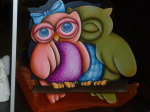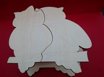 Caixa de madeira em choupo com recorte a laser de mochos com abertura central.