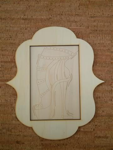 Quadro de madeira (choupo) com desenho gravado e com moldura de madeira em choupo com recorte a lazer.